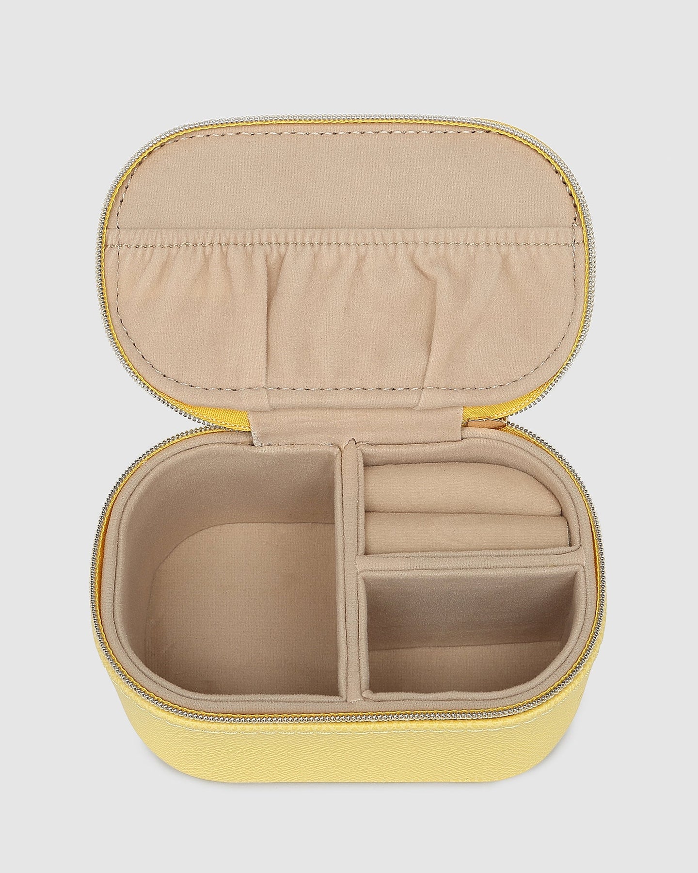 The Louenhide Olive Lemon Jewellery Box is a sweet oblong accessories box perfect for travel or everyday use. Keep your jewellery safe and secure in Olive Lemon's separate compartments, elasticated pocket, and ring rolls. This affordable jewellery case is versatile and will fit comfortably in your handbag for on-the-go styling!