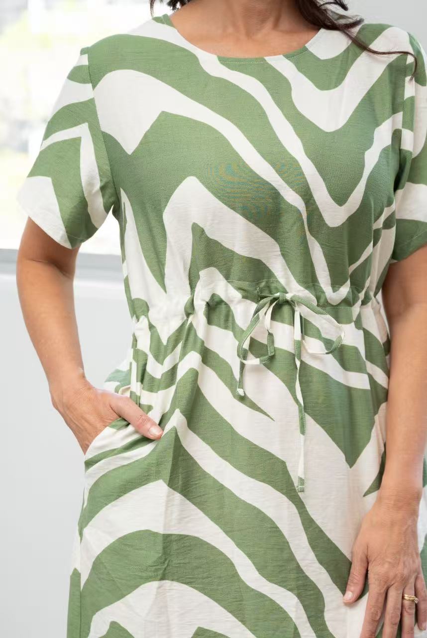 This gorgeous dress with a flowing A-line silhouette features a gently gathered waist with an adjustable drawstring for a comfortable, flattering fit.