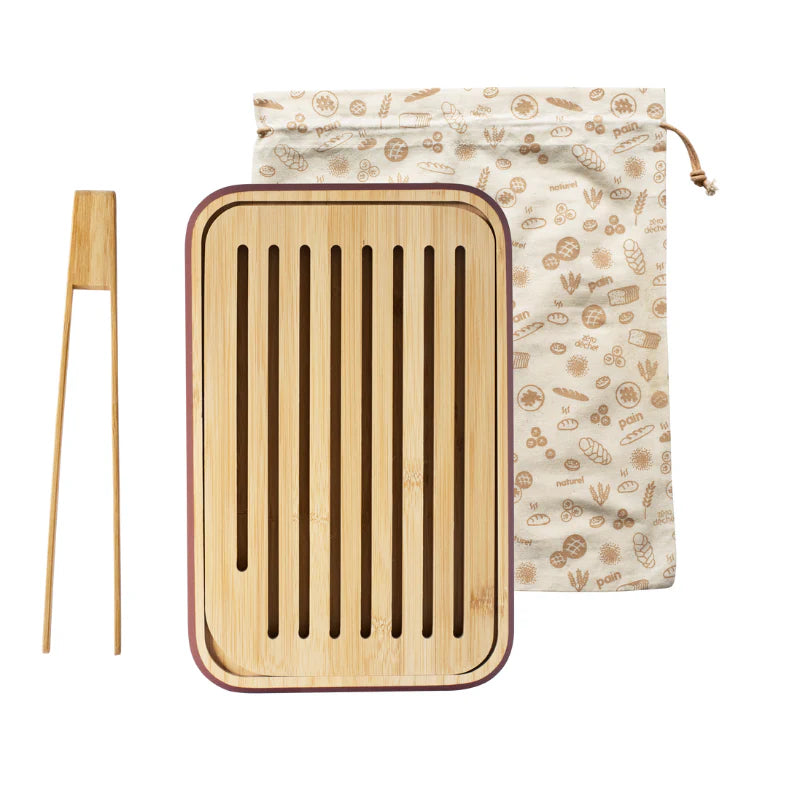 It’s extremely useful for your daily preparations and includes a small bamboo board, tongs and organic cotton bread bag.